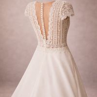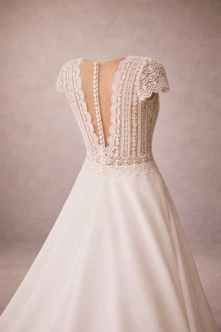Vestido de novia con silueta en línea A y estilo clásico, confeccionado en garza combinada con encaje y pedrería. Muestra un escote profundo, una Silueta: Linea A Escote: Escote...